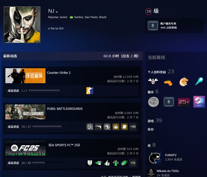 直播吧02月08日讯内马尔是cs游戏的资敬爱好者,公开信息清晰,内马尔的账号cs2游戏时长达到了11349小时,pubg游戏时长5085小时,值得一提的是,这两个游戏的终末启动本领即是昨天。